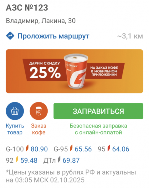 АЗС около Автодома. За качество прошу прощения - фотографировал с максимальным увеличением. [attachment=370273:PXL_2025...242013_2.jpg] Заправляла сегодня 92-й по 59.48 на Газпромнефти и по 58.79 на Татнефти. А напротив Татнефти какая-то заправка с красным логотипом с ценой 70. Можно наверное и больше найти при желании. |